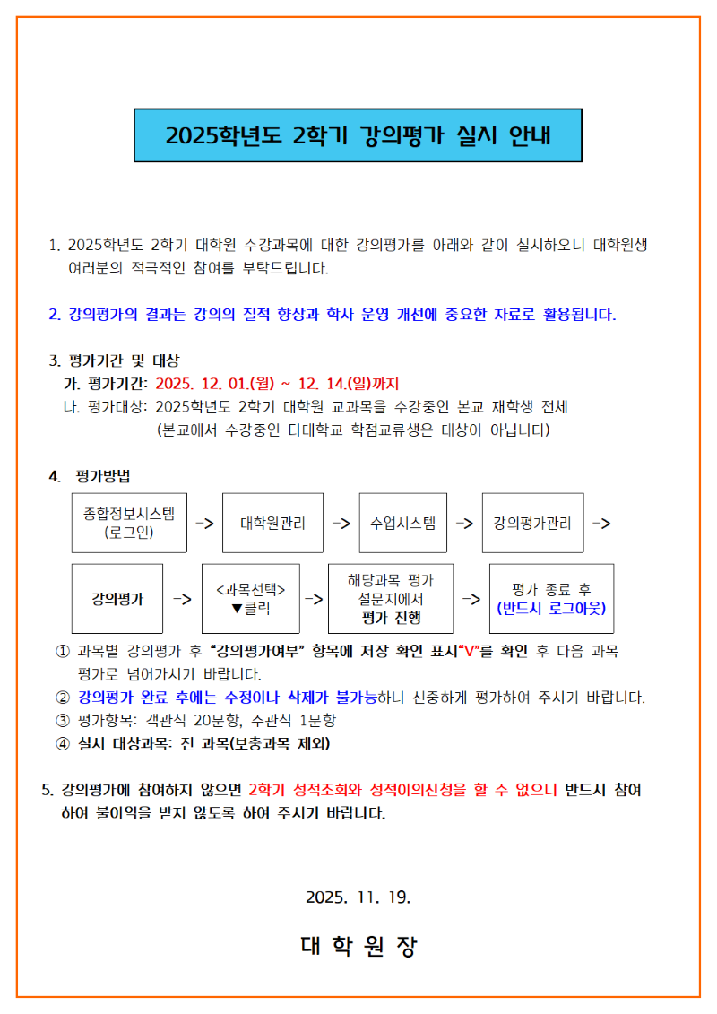 [강의평가] 2025학년도 2학기 대학원 강의평가 실시