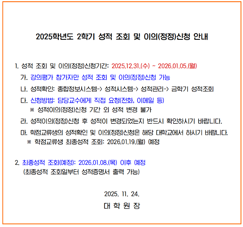 [성적] 2025학년도 2학기 성적조회 및 이의(정정)신청 안내