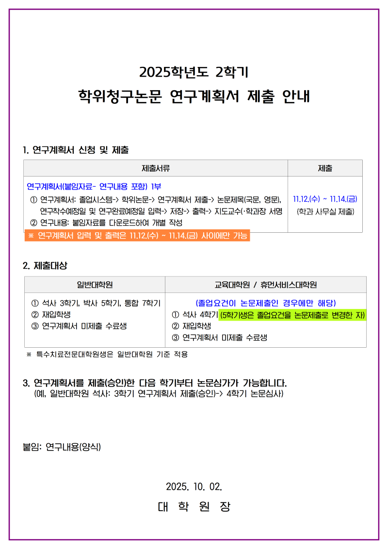 [논문] 2025학년도 2학기 학위청구논문 연구계획서 제출 안내